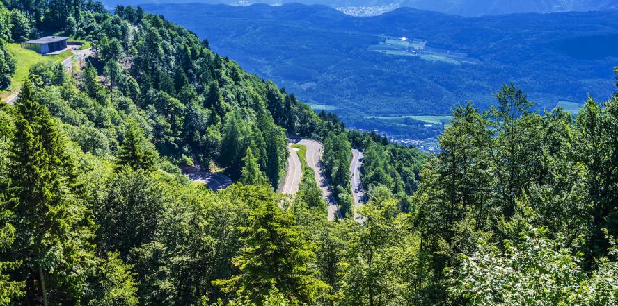 Südwestlich von Bozen erstreckt sich von Sigmundskron aus der Mendelpass in luftige Höhen von 1363 Metern und endet nach gut 40 Kilometern im beschaulichen Cavareno. Historisch gilt er auch als Sprachgrenze zwischen deutsch- und italienischsprachigem Südtirol. Die Straße ist auf beiden Seiten gut ausgebaut und bietet Steigungen von bis zu zehn Prozent. Auf der Nordwestrampe sollte man schwindelfrei sein, da die Straßenbauer sie – übrigens schon zum Ende des 19. Jahrhunderts – recht eng an den Felsen platziert haben. Von der Passhöhe aus lohnt sich ein Abstecher auf die kleine Stichstraße, die einen nach gut vier Kilometern auf den Penegal – und dort zu einem netten Aussichtsturm bringt.